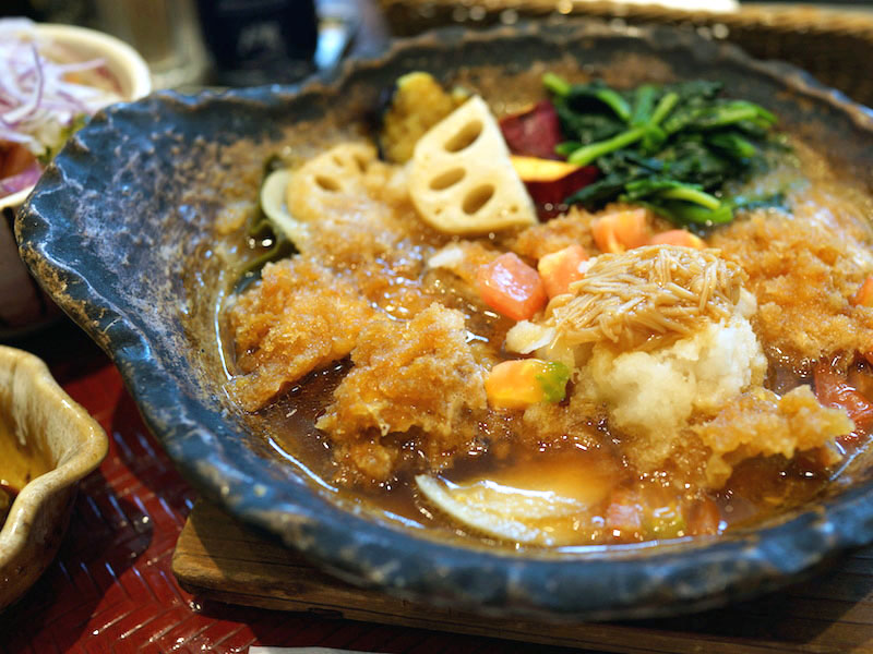 チキンフライをざっくり切って、出汁で煮込んで大根おろしとなめこの佃煮をあしらい食べる。玉子を使わず、出汁だけで煮込んでいるから、さっぱりとした食べ心地にて、サイドの野菜もタップリでよい。