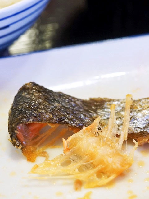 ちなみに本日、鮭の皮…、食べてやろうと思ったんだけど鯖の薄い皮とは違ったこの頑丈な存在感に、やはり果たせず残してしまう。