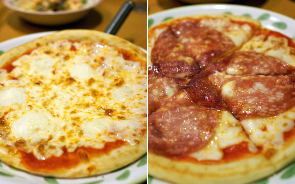 単品メニューのサラミをたのみ、それをモツァレラチーズの上に散らしてなじませる。チーズのむっちりした食感とサラミの風味、生地がトロリととろけてなかなかおいしくなった。
