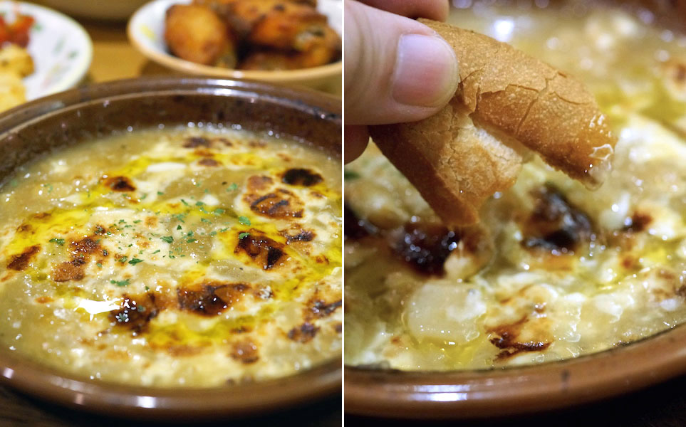 トロトロになるまで煮込んだ玉ねぎと切ったジャガイモ。カラメルっぽい焦げた風味をくわえたスープでコトコト煮込んで、最後にチーズ。オーブンの中でこんがり焼いてやってくる。