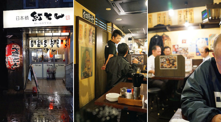 場所は紅とん…、雨というのにかなりのにぎわい。近所のおなじみさんたちが中心のようで、お店の人と気さくに会話を交わしてにぎやか。