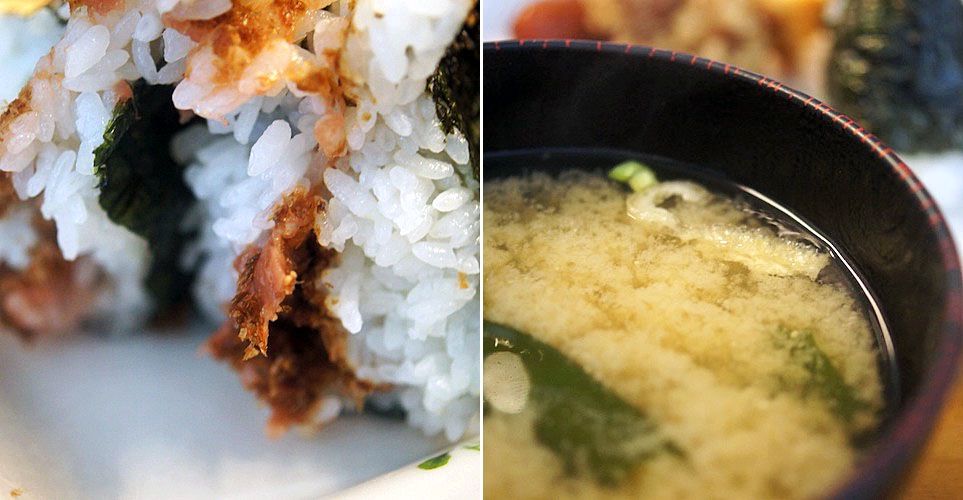 お揚げにワカメ、それからネギが入った出汁のおいしい味噌汁…、テイクアウトでもっていけるよう豆腐のような壊れやすいものを使わず作った、けれどお味噌がタップリ入ってて旨み、風味もずっしり、濃厚。