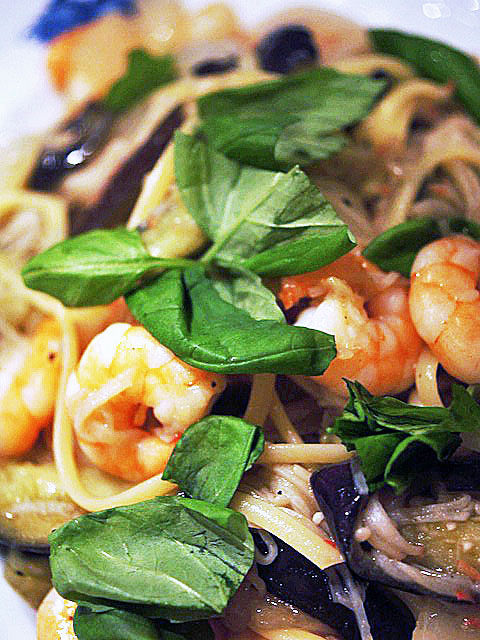 フレッシュバジルをちぎってちらし、ちょっと甘目の海の幸味のパスタが完成。