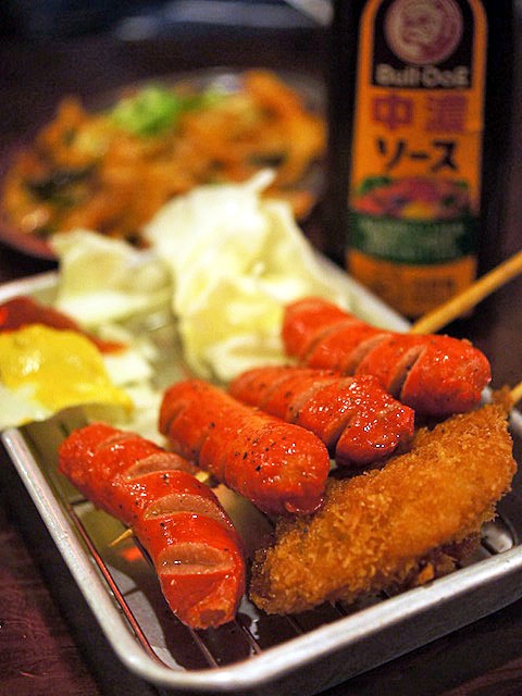 ココに来ると必ずたのむウィンナさんの串揚げに、アジのフライをつけてもらった。