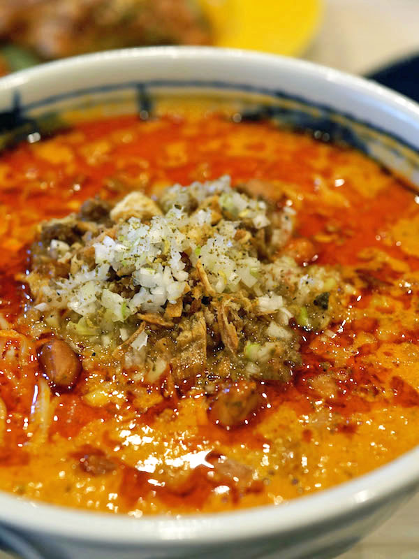 ポッテリ系とサラサラ系のちょうど中間程度の濃度で、スープ自体のコクがいい。そこにゴマの風味と軽い渋味が混じって濃厚。干しエビやピーナツがゴロゴロ中に入ってて、その食感もよきアクセント。