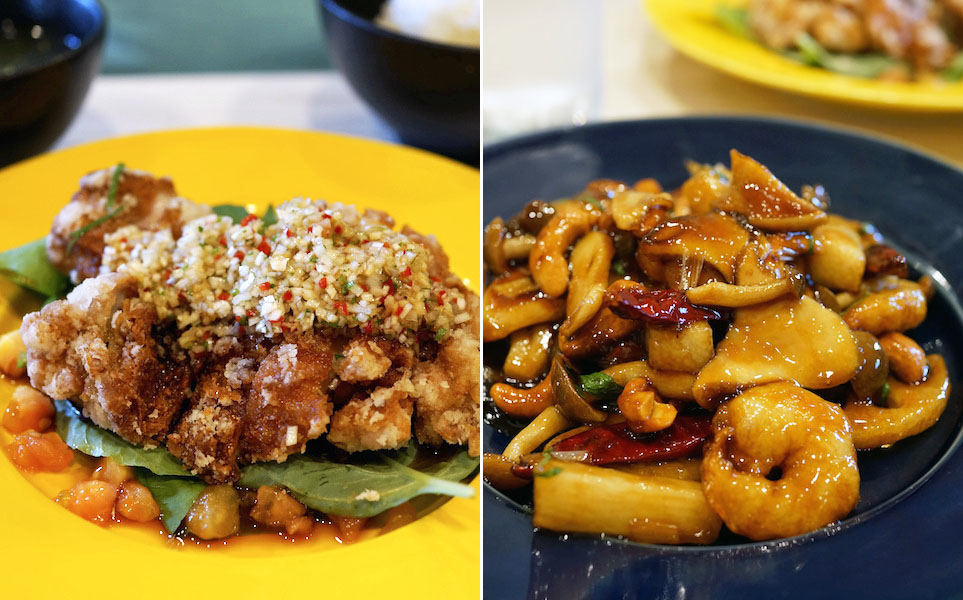 エビとキノコのカシューナッツ炒めはこってり。オイスターソースの味わい濃厚。拍子木にした山芋や、輪切りのレンコンと野菜の食感もたのしくて、これまたご飯がすすむ一品。なにより香りがいいのが食欲そそる。