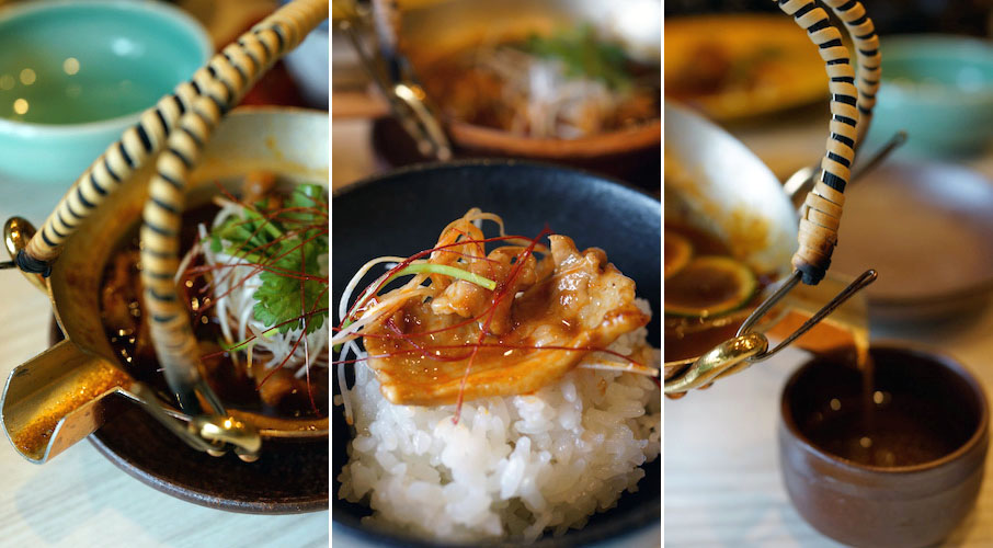 豚肉食べて終わると一旦、厨房に戻してチンタン。スダチをくわえてスープに仕立てて戻ってくる。それをお猪口で飲む趣向。