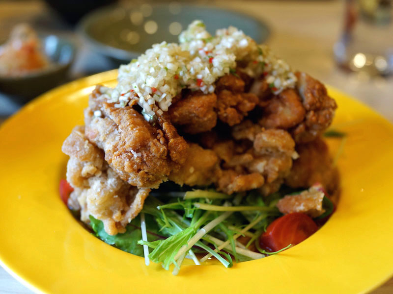 生の野菜をベッドにし、上にドッサリ、揚げた鶏。サクッと皮がこんがり揚がり中はフックラ。噛みごたえがあり、しかも鶏の味わい豊か。