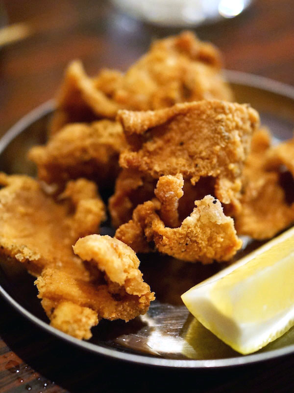 バリバリって揚がっておいしい匂いを吐き出し、旨そうだなぁって思いはするけどコレが鶏の皮なんだ…、って思うとやっぱり手が出ない(笑)。