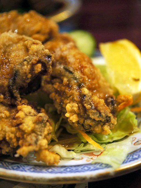 粉をはたいて揚げたのを、オイスターソースでササッと炒めて味ととのえる。