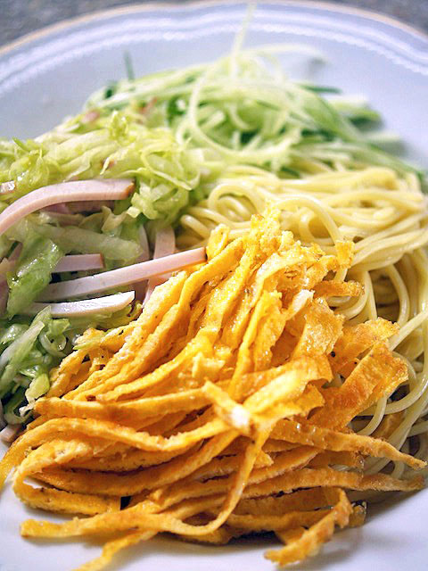 冷たいタレとの絡みがよさそうで、固めに茹でて水でキリッとしめてやる。