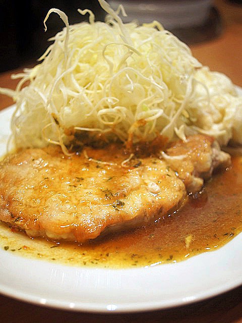 中でもおいしい食べ方が、豚肉のソースにタップリ浸して食べる、ニンニクバジル風味のキャベツでそれで十分、ご飯のおかずになったりもする。