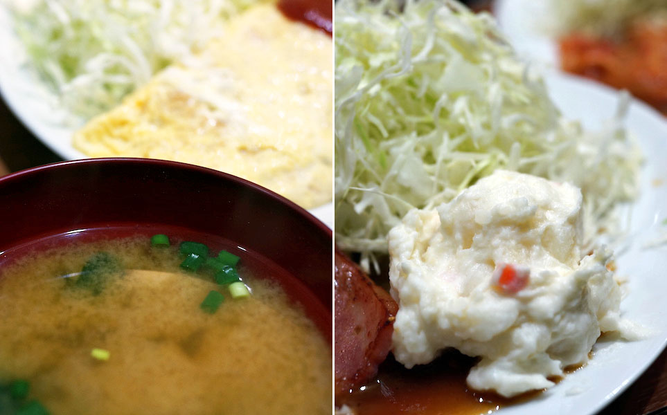 千切りキャベツに牡蠣の風味のついたバターソースを浸して味わう。シャキシャキシャクシャク、歯切れて奥歯で潰れる食感痛快で、そこで味噌汁。