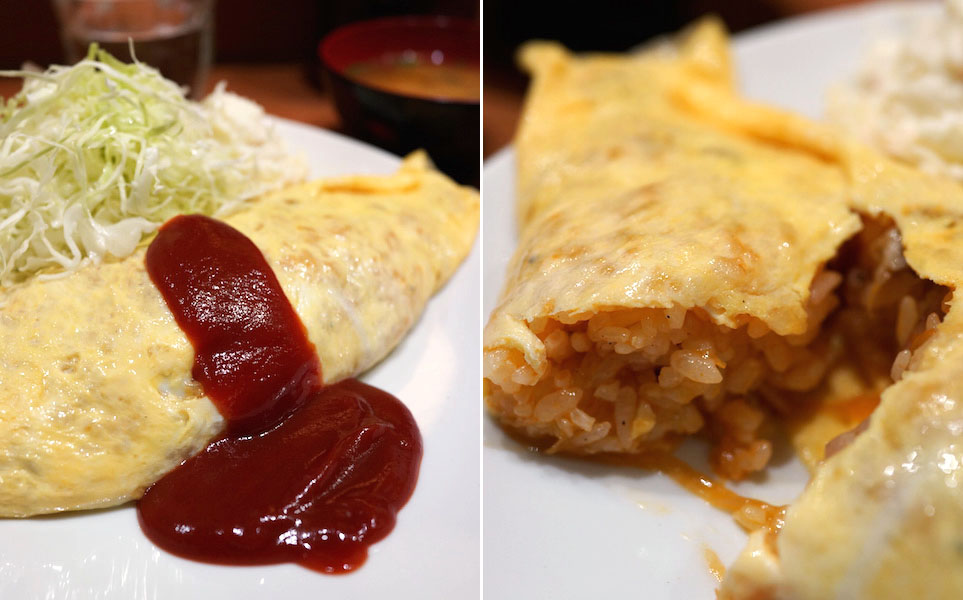 薄焼き玉子でクルンとご飯をくるんだスタイル。玉子はしっとり、とは言え生の部分はほとんどなくてしっかり熱が入ってる。