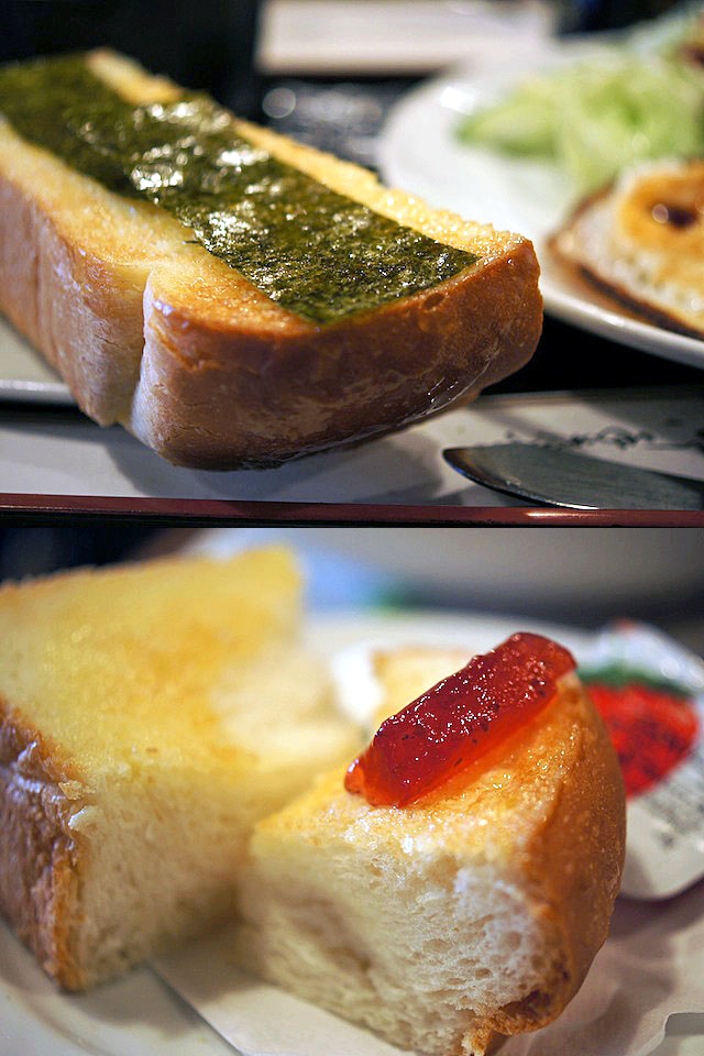 バターの風味と醤油の味で、トーストの上の海苔がたちまち佃煮のような味になり、パンをまるで磯辺焼きのように味わいにする。