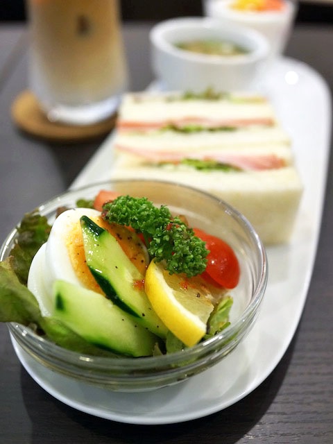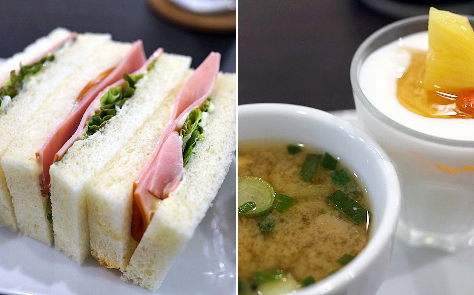 サラダに、ハムとレタスのサンドイッチ、そこにフルーツヨーグルトがついていつものひと揃え…、料理の中身は変わらないから安心できる。