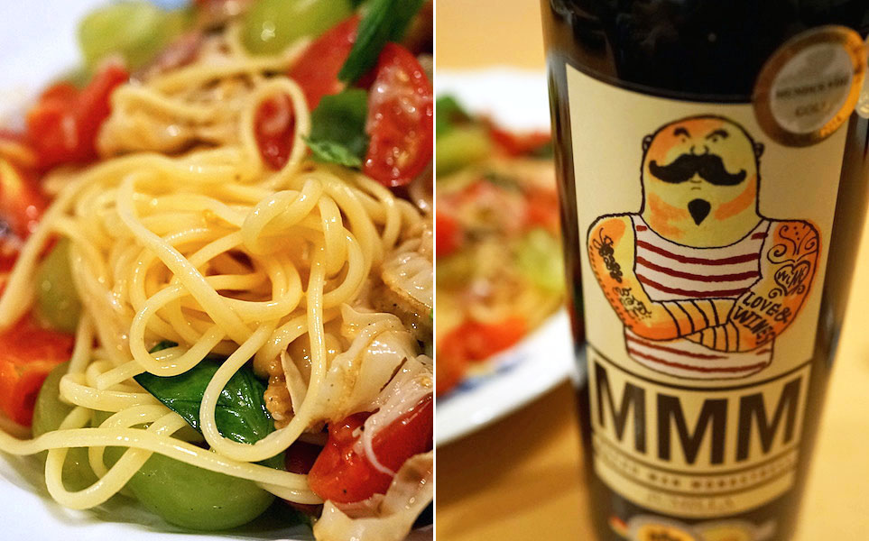 エチケットのデザイン買いをしたワイン…、ドッシリとした旨みと強い渋味が今日のパスタにピッタリ。