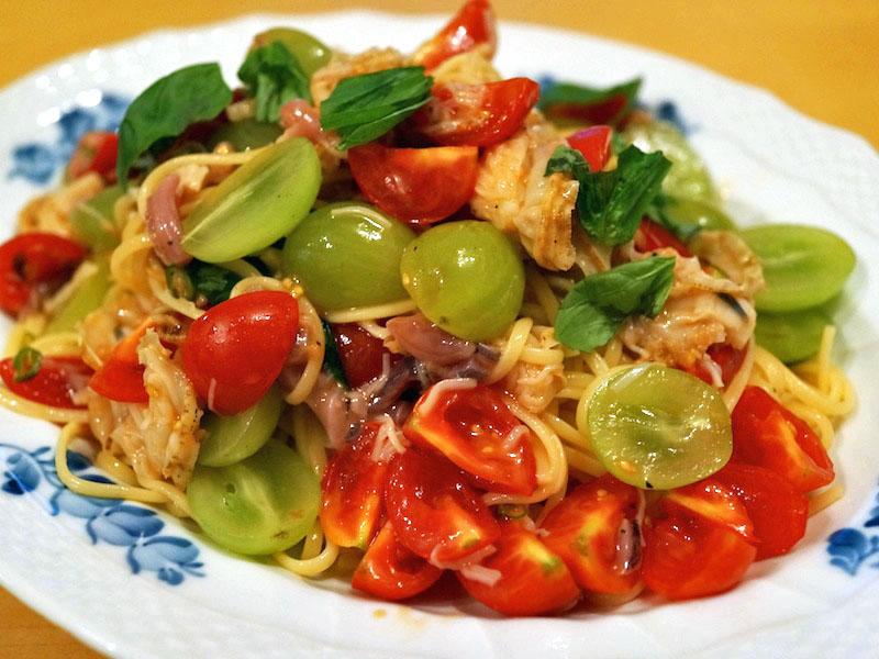 トマトの酸味と明るい甘み。海の旨みに塩の風味で味の基本がキッチリできて、そこにぶどうの甘みがまじる。カリッと皮の食感もよく、最後の最後で青唐辛子の辛味がヒリッと舌をつねって熱くする。