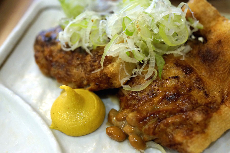 ココにくると必ず食べる巾着納豆。慣れていない人が作ったのか、袋が破れて中から納豆が飛び出していた。