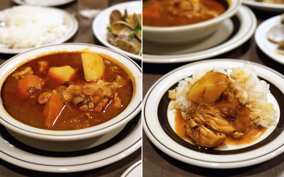 サラサラとした鶏のスープがドッシリとしたおいしさのカレーの中でクツクツ炊かれた鶏にジャガイモ、大きなニンジン。