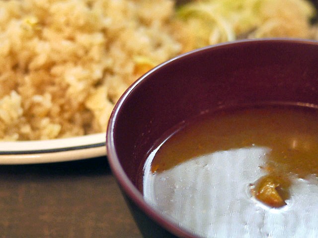 空のお茶わん、余分にもらってチャーハン入れてスープをスプーンですくって注ぐ。