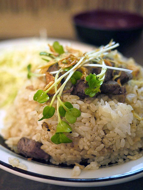 細かく刻んだネギとニンニク、ご飯の上には別に炒めた一口大の牛肉ステーキ。