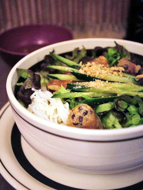 パリパリに揚がったベトナム春巻を一口大に切ってのっけて、キュウリに最後にザクッとくだいたピーナッツ。