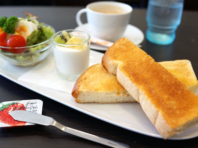 こんがり焼けた厚切りトースト。サラダにフルーツヨーグルト、イチゴのジャムがついて朝のひと揃え。