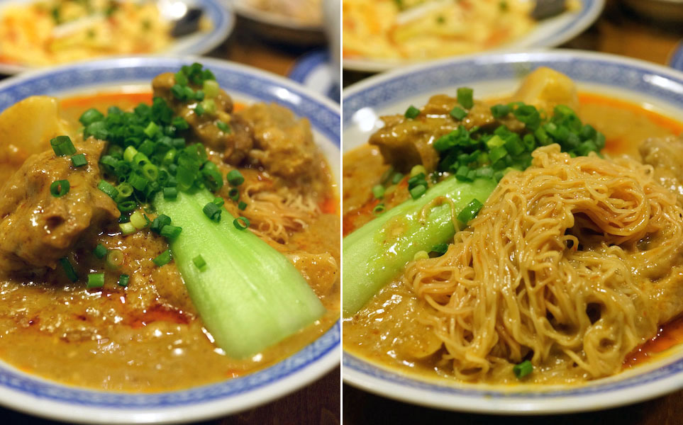 ホロッとほぐれる、良く煮込まれた鶏にジャガイモ。ココナツ風味のカレーが極細香港麺にタップリからむ。そのジャガイモが砕けてカレーがホロホロ、ちょっと粉っぽい。それがザクザク歯切れる香港麺にからんで不思議な歯ざわりとなる。