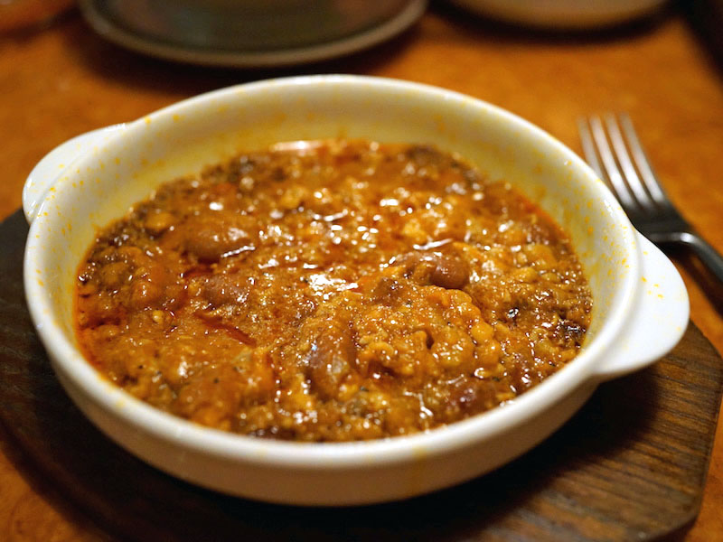ひき肉じゃなく煮込んで煮込んでホロホロにした牛すじ肉。ホックリとした豆もたっぷり。