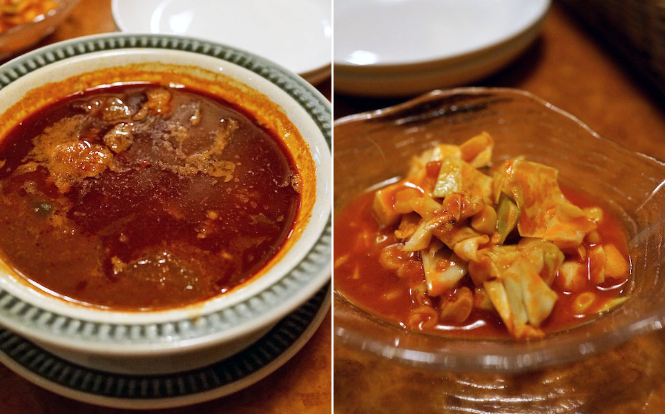 牛肉の味がドッシリとしたスープは本当においしいのです。韓国料理のユッケジャンから甘みを除き、酸味を加えたみたいな感じといえばいいかなぁ…。濃いブイヨンに澄んだ牛肉の脂の旨みとカイエンペパーの辛味をくわえた、辛く癖して旨みが強く、飲み始めると止まらぬおいしさ。