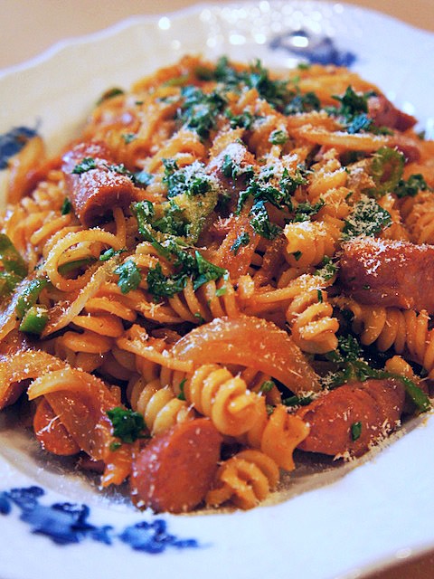 買い置きスパゲッティが一人前に足りなくて、それでフィジリを混ぜて作った、だからクニュクニュとしたショートパスタの食感が、スパゲティーに混じってにぎやか。