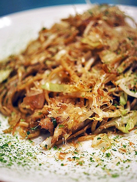 野菜を焼いて、そのかたわらで豚ばら肉をガリッと焼いて麺とあわせて出汁で蒸し、ソースでジャジャっと個がしつつお皿にもってタップリ青海苔、鰹節…、食べるとちょっと薄味でソースやマヨネーズで自分好みに味を作って食べるところも昔のまんま。