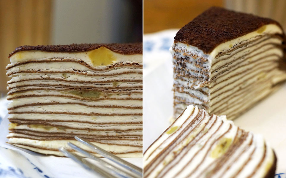 今の季節のミルクレープは「チョコバナナミルクレープ」。チョコでバナナでミルクレープと、3つの好物が全部揃ってひとつになってる。