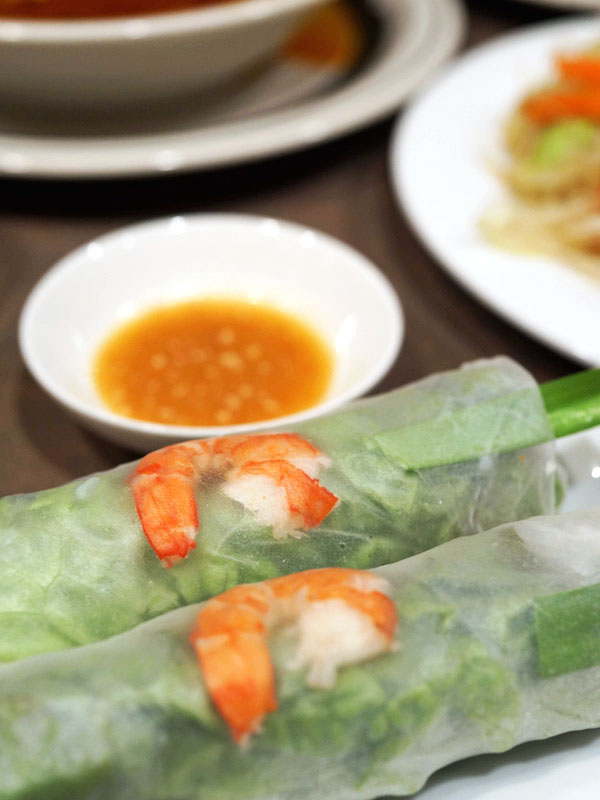 ムチュンと皮が粘って歯切れ、中の葉っぱがシャキシャキ鮮やか。砕いたピーナツの風味濃厚なスイートチリのソースにつけて、風味豊かをたのしみ食べる。