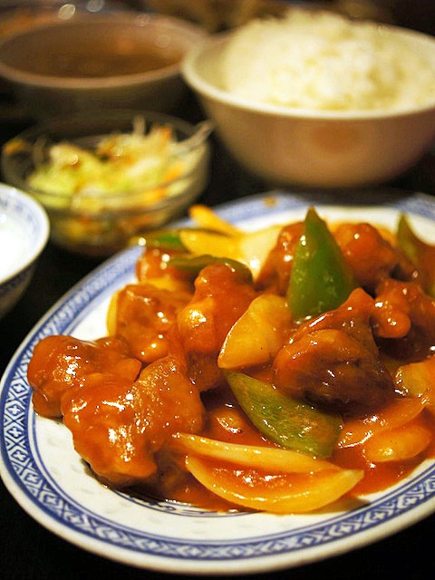 昨日のお昼に食べた黒酢の酢豚と違って、いわゆる甘酢のケチャップ酢豚。