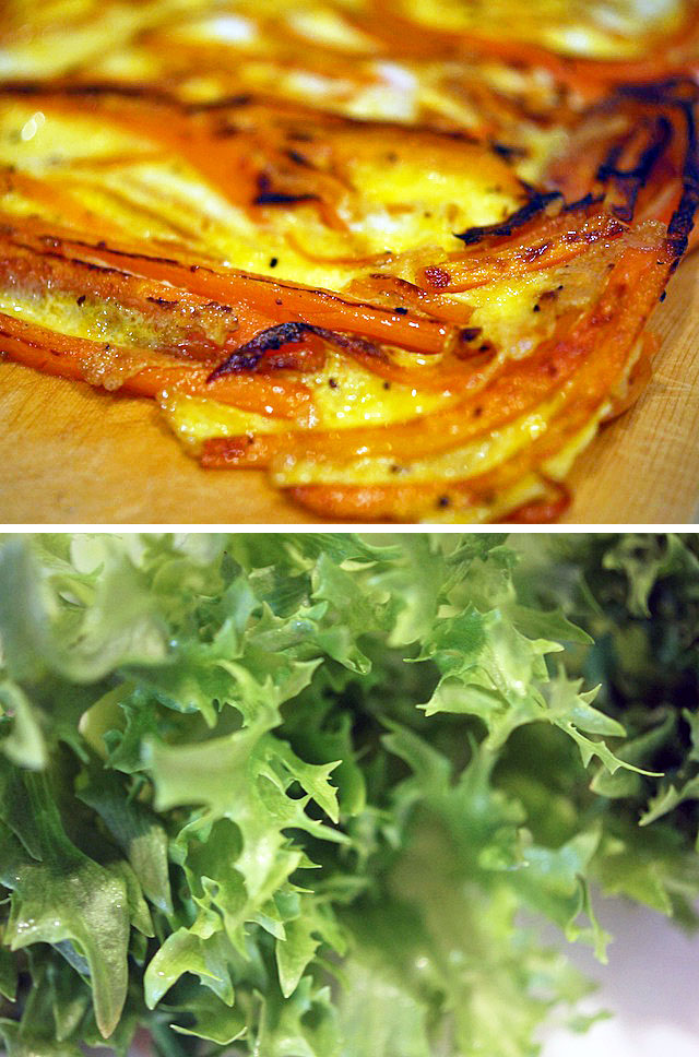 まな板で蓋してしばらく蒸し焼きにするとニンジン薄焼き卵が一枚できあがり。