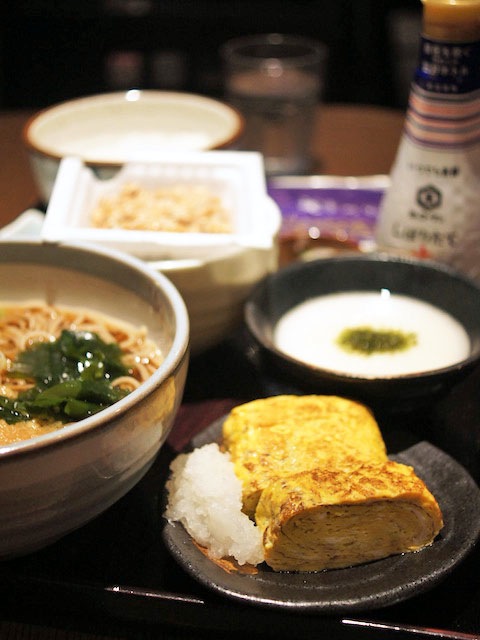 ここのお店の朝の全部のせの定食で、だし巻き卵に納豆、山芋とろろに焼き海苔。