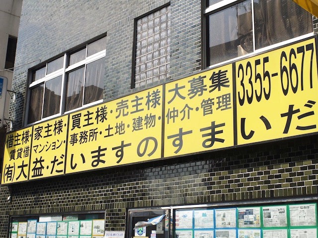 大増っていう不動産屋さんの袖看板なのだけれど、お店の前にはフルバージョン。