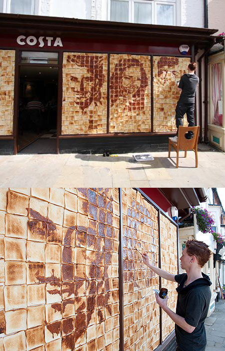 トーストをカンバスに絵を描くアートで、焼いたパンにマーマイトとジャムを使って描いてるらしい。