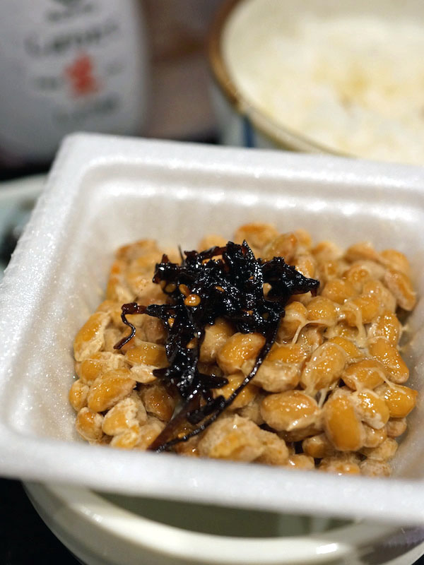 納豆はパックに入った一人前分。蓋をペキッと開けて、フィルムを剥がして昆布の佃煮をのっけて食べる。