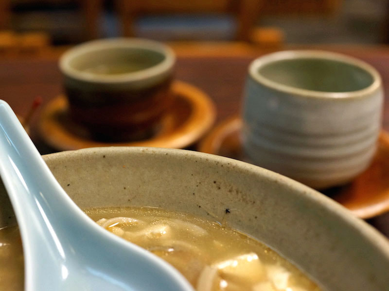 七味をパラリ…、すると汁の甘みがグイッと引き立って、蕎麦の香りも華やかになる。れんげですくって食べないと、熱くて丼が持てないほどにずっと熱さが持続するのもステキなところ。あったまる。