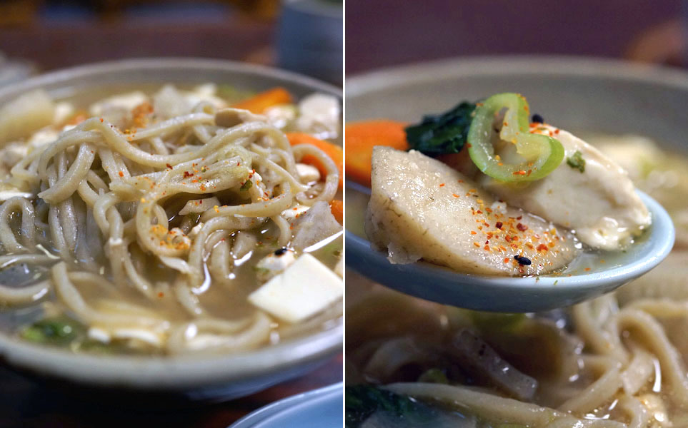 熱い汁の中にずっと休んでいても、クタクタで正体不明になったりしない。むしろ蕎麦の風味がいきいき、濃厚になり、ネットリとした蕎麦独特の粘り気がでて肉感的な食感になる。鍋焼きそばでも十分おいしい蕎麦を熱々のけんちん汁と一緒に味わう。今の季節の贅沢なりのオキニイリ。