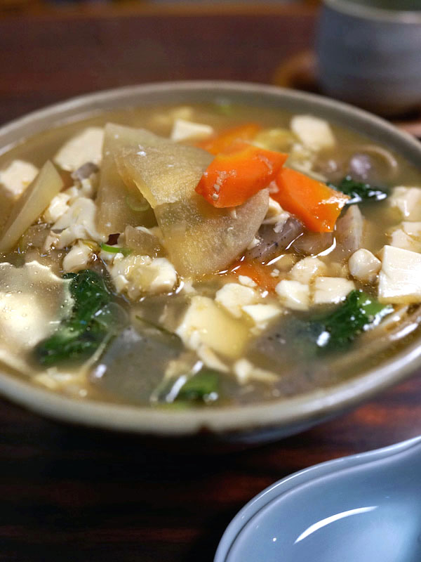 大根、ニンジン、こんにゃく、小松菜。それから里芋。豆腐がタップリ、ふるふる崩れて食感なめらか。