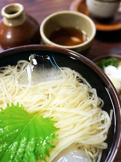 伸ばして作るソウメンと、切って仕上げる冷麦と…、そんな違いがハッキリわかる平べったくもキレイに角の立った麺線、それみほどよく不揃いで、あぁ、手作りだってウットリします。