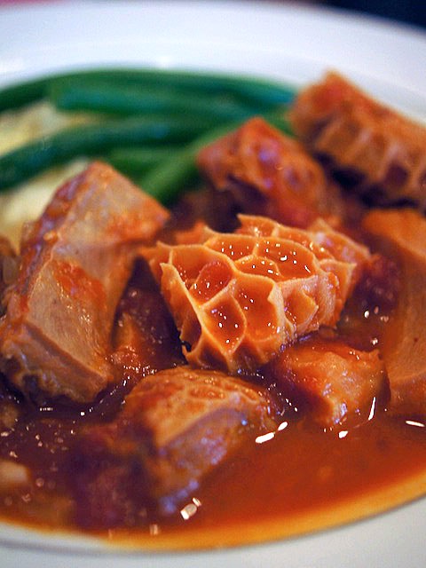 フォークの背中で優しく押すと、ホロッとほぐれて筋やら脂、ゼラチン質が肉の繊維と渾然一体…、豚肉のゼラチン質とは違った唇までが貼り付くような強い粘り気、スキッと後味サッパリとしたうま味がおいしい…、古典的にて変わらぬ味にウットリします。