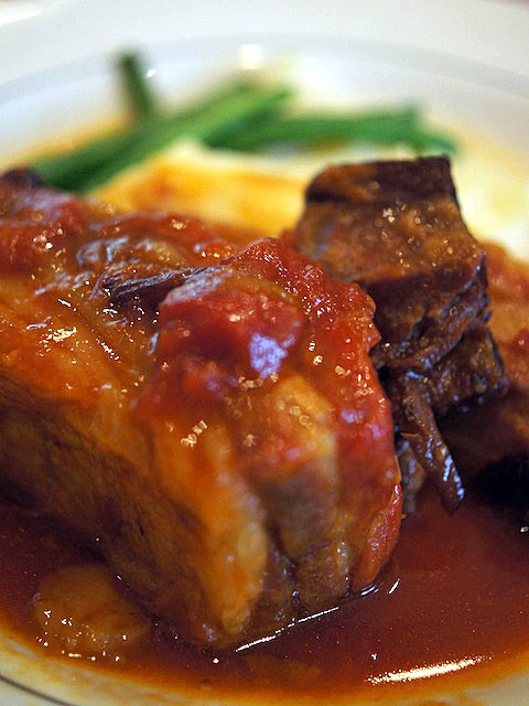 脂ののった豚ばら肉を表面ガリッと焼き上げて、トマトソースで煮込んだメインのこの料理。