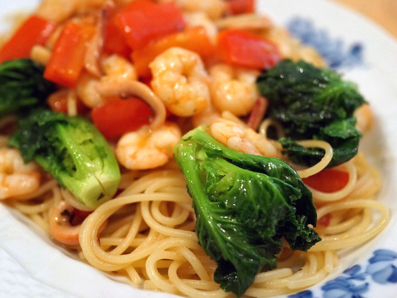 ペペロンチーノオイルをつくり、そこでエビを軽炒め。味がオイルにうつったところで、赤いパプリカ。そしてピピッとパスタがあがり鍋に移したところで塩辛。
