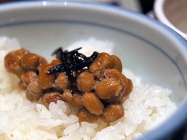 納豆を海苔でくるんで、ご飯と一緒にパクンネットリ、タンパク質の補給をします。