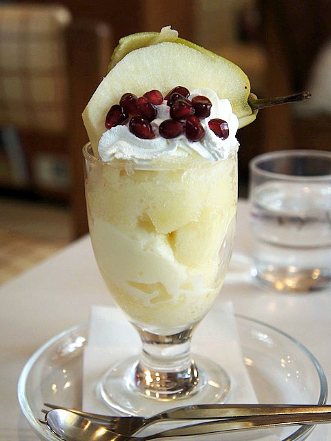 すくっと背の高いパフェグラスの一番底には一口大に切ったラ・フランス。